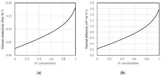 All substrate and mixture gas properties were assumed to be constant regardless of temperature variation. The thermal conductivity of the mixture gas as a function of hydrogen concentration was calculated using the thermal conductivity correlation equation proposed by Mathur for binary gas mixtures [22]. Furthermore, air and hydrogen were treated as ideal gases, and their densities and specific heat capacities were determined as weighted averages based on mole fraction and mass fraction, respectively. The densities were calculated by multiplying the volume fractions with the individual densities of air, 1.16 kg·m−3, and hydrogen, 0.0808 kg·m−3. The specific heat capacity of dry air at room temperature was 1.007 kJ·kg−1·K−1 and hydrogen’s specific heat capacity was 14.31 kJ·kg−1·K−1. These values were averaged by their respective mass fractions to obtain specific heat values as a function of concentration. The thermal conductivity and thermal diffusivity of the mixture gas as a function of hydrogen concentration are depicted in Figure 3. For the substrate materials, SiO2 and polyimide were assumed to have thermal conductivities of 1.2 and 0.17 W·m−1·K−1, and thermal diffusivities of 7.2 × 10−7 and 1.1 × 10−7 m2·s−1, respectively.