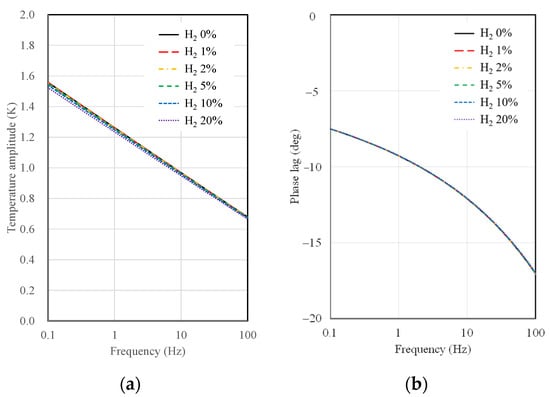 Calculation results of (a) temperature amplitude and (b) phase lag depending on AC frequency and hydrogen concentration for 10 μm width 3ω sensor on a SiO2 substrate.