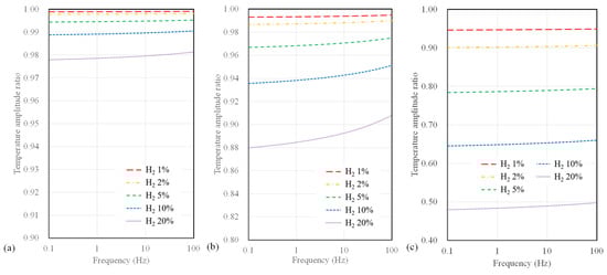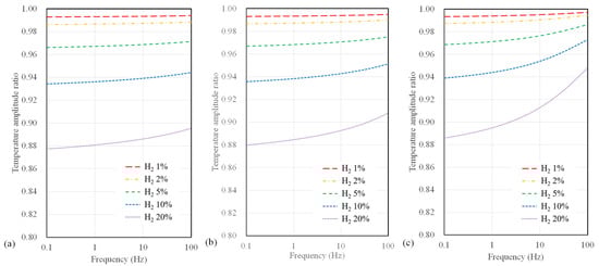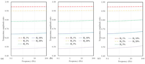 Calculation results of temperature amplitude ratio depending on AC frequency and hydrogen concentration for polyimide substrate sensor with widths of (a) 4 μm, (b) 10 μm, and (c) 40 μm.