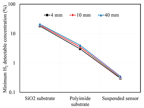 Minimum detectable hydrogen concentration depending on substrate types and sensor width.
