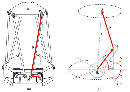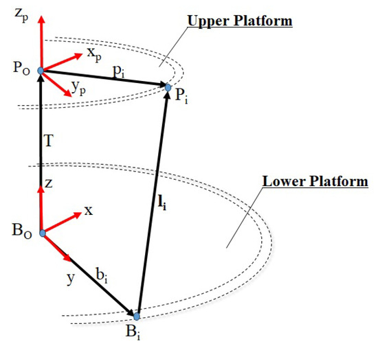 The vector T represents the translation from the origin in the lower platform to the origin in the end effector, where . One of the junction points of each platform, the vector from to , and the vector from to are depicted in Figure 1 as vectors and , which are generalized as vectors and shown in Figure 2a. The vector represents the extension of the prismatic actuator, as depicted in Figure 1 and Figure 2.