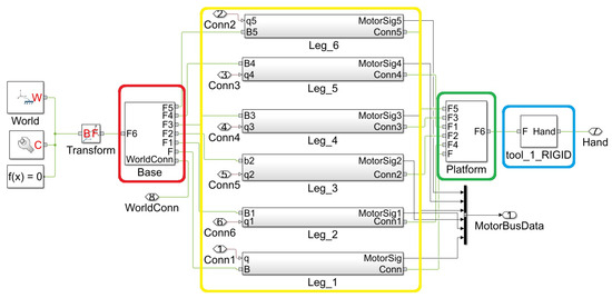 In the red rectangle, the fixed/inferior platform is represented, which in this case is being used as the reference base body. The yellow rectangle indicates the block composed of connecting rods and joints, and also shows the actuators and sensors. In green, there is the upper platform, followed by the blue rectangle representing the modular tool attached to the platform.
