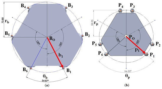 Construction and sizing parameters of the manipulator. (a) Lower platform parameters. (b) Upper platform parameters.