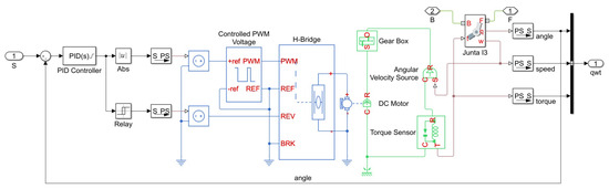 The second simulation approach involves using a pre-specified actuator, enabling the study of motion and forces given a particular motor. This simulator allows for the simulation of BLDC motors, stepper motors, and DC motors. For this case study, DC motors were considered, as shown in Figure 5. Generic parameters for a DC motor were used for the simulation, and the model was applied to each of the six motors on the platform. With the motor modeling, a control system is required. In this case, a PID (proportional–integral–derivative) controller was used, responsible for correcting the actuator’s position based on the required setpoint position in comparison to the current position of the motor .