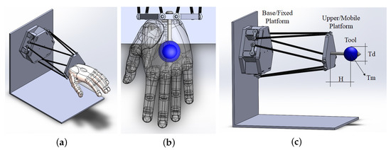 View of the Stewart platform configuration from different perspectives. (a) A human hand-shaped tool attached. (b) The hand-shaped tool being replaced by a sphere-shaped tool. (c) Representation of the dimensions of the modular tool.