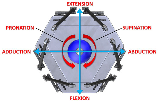 For a better understanding and comparison between wrist movements and platform movements, from this point in the text, the yaw (), pitch (), and roll () motions will directly correspond to abduction/adduction, extension/flexion, and supination/pronation movements of the wrist, respectively, as illustrated in Figure 7.