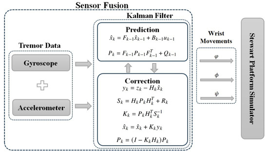 The KF is computationally efficient, making it suitable for real-time implementations. As a result of the KF’s output, the angles related to wrist movements, including the rotation angle, are obtained. Thus, the data are ready to be used as input for the system represented by Equation (19).