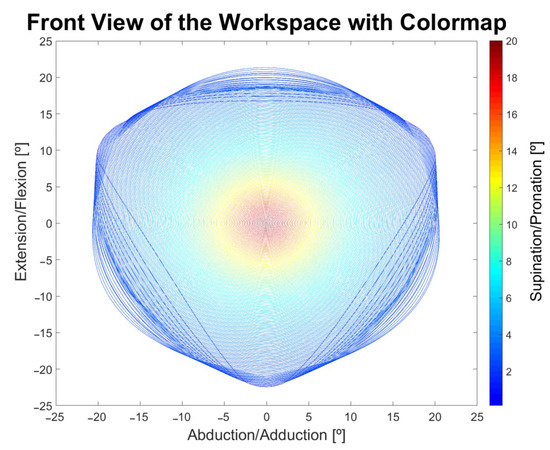 With the aim of visualizing the mechanical limits of the platform, the simulator was used with an ideal motor, as the forces involved in the movement were not evaluated at this stage. In the graph of Figure 10, the complete workspace in two dimensions can be observed, considering the perspective of the frontal plane. The color scheme of the graph defines the maximum range of platform rotational mobility, where darker colors represent a greater capacity for supination/pronation, while lighter colors indicate lower rotational mobility at a specific position. It can also be observed that in the space where there is a high degree of inclination, both for extension/flexion and abduction/adduction, there is a lower capacity of the platform to perform the wrist rotation supination/pronation movement. This is due to the fact that the high degree of inclination of the platform puts more stress on the limits of some actuators, preventing the movement of other DOFs. However, this is an expected design characteristic of the Stewart platform itself.
