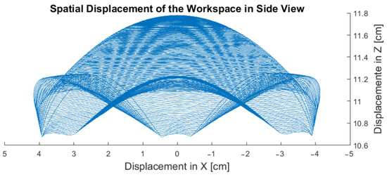 In Figure 11, it is also possible to visualize the workspace from a spatial perspective in terms of displacement. It demonstrates the spatial displacement of the modular tool attached to the upper platform from a side view of the three-dimensional workspace. The displayed displacement is proportional to the length of the tool used. It can be observed that when attempting to exceed the limits of abduction/adduction and extension/flexion movements, the upper platform starts to exhibit movement errors. This behavior is due to the mechanical limitations that are inherent in the developed design.