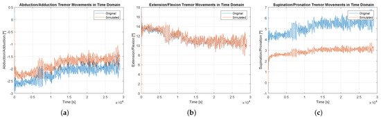 Evaluating the Pearson correlation coefficient, the values obtained were 96.53% for supination/pronation, 99.46% for extension/flexion), and 96.66% for abduction/adduction, demonstrating a strong correlation between the real and simulated signals. It should also be noted that the data presented in Figure 12, Figure 13 and Figure 14, refer to only the right hand of one of the 10 participants.