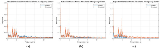 Frequency domain graphs related to the right hand of patient 2. (a) Abduction/adduction movements. (b) Extension/flexion movements. (c) Supination/pronation movements.