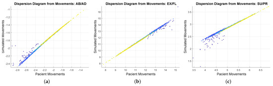 Scatter plot relative to the movement of the patient and the simulator, where the variation in shade of colors represents time, starting from the blue tone. (a) Abduction/adduction (AB/AD) movements. (b) Extension/flexion (EX/FL) movements. (c) Supination/pronation (SU/PR) movements.