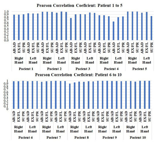 It should be emphasized that the same tests were reproduced for all patients. In the graph represented in Figure 15, the Pearson correlation coefficient was calculated for all patient samples, and the overall average remained above 0.9474. In some cases, the coefficient fell below 0.8, such as in the abduction/adduction movement of the left hand of patient 4, and also in the same movement of the right hand of patient 3. In these specific cases, patients exhibited relatively low amplitudes in these movements when compared to their own hands or even those of other patients. This characteristic may occur in patients who do not exhibit bilateral characteristics in their tremor symptoms, or alternatively, the tremor in these patients shows lower intensity in certain movements. Thus, the platform was unable to accurately represent the signals of these components.