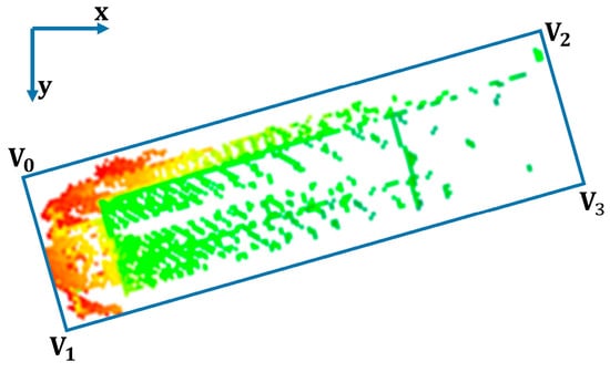 However, in our experiments, we found that some boats were not always parallel to the x-axis, like in Figure 3, so we needed to optimize the calculation of the vessel’s width and length. We then traversed the four vertices according to the value of x. The width of the vessel was the L2 norm of the lineV0V1. Then, the length, position x, and position y of the vessel were as in Equations (3)–(5):