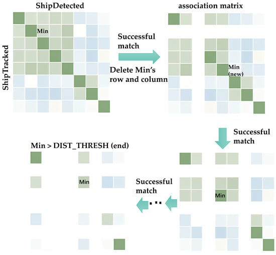 The rows of the correlation matrix are the numbers of the vessels in VesselDetectInfo and the columns are the numbers of the vessels in VesselTrackInfo. Through a comparison of the minimum value in the correlation matrix and the correlation threshold, we defined these values. If the minimum value was less than the association threshold, then we marked it as a successful match. We updated VesselDetectInfo and VesselTrackInfo and then updated the association matrix. We deleted the corresponding rows, as shown in Figure 4, until the minimum value in the matrix was not less than the correlation threshold to jump out of the while loop. If there were vessels in VesselTrackInfo that had not been matched, we performed MatchedCnt—. Then, we gradually erased the vessel that made out the viewpoint according to the value of MatchedCnt. If there was a vessel in VesselDetectInfo that was not matched, we added that vessel to VesselTrackInfo and VesselHistory. If the buffer was full during this process, then we deleted the vessel in VesselTrackInfo and VesselHistory that had the smallest MatchedCnt.