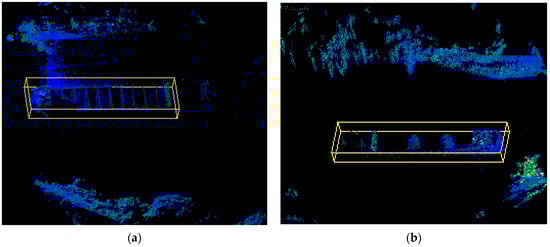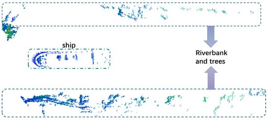 Figure 5 shows the original point cloud data of a certain frame; we can see that there were many point clouds of trees and riverbanks along the river. This resulted in a considerable volume of data being processed with reduced efficiency. Therefore, we preprocessed the raw data and cropped out the point cloud of the shore.