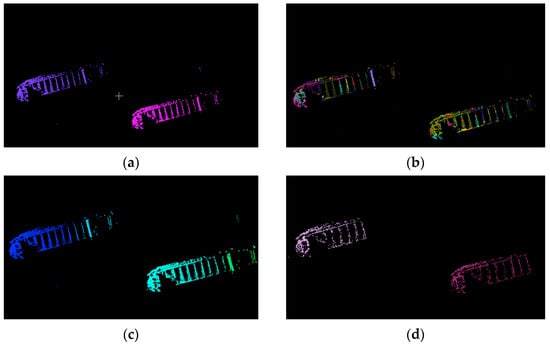 The effect diagram of four clustering algorithms. Different colors represent different clusters. (a) K-means cluster; (b) super-voxel cluster; (c) DBSCAN; (d) Euclidean cluster.