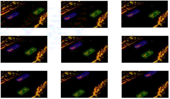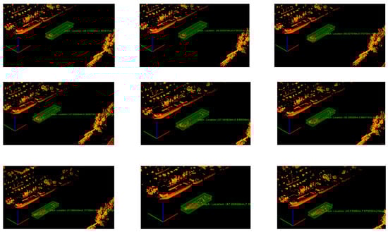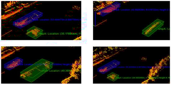 As shown in Figure 8 and Figure 9, the 3D bounding boxes were the identified vessel. When multiple ships were present, they were denoted by distinctly colored 3D bounding boxes. As Figure 9 illustrates, it was evident that the system consistently maintained precise detection, even in scenarios involving multiple vessels. To validate the accuracy of our detection algorithm, we compared it with three other algorithms: PointNet [], YOLO3D [], and PointRCNN []. For each algorithm, we tallied the number of correctly recognized targets as well as the number of false recognitions. The accuracy rate was then computed by dividing the number of correct recognitions by the total number of targets within the field of view, as illustrated in Table 2.