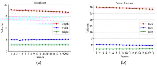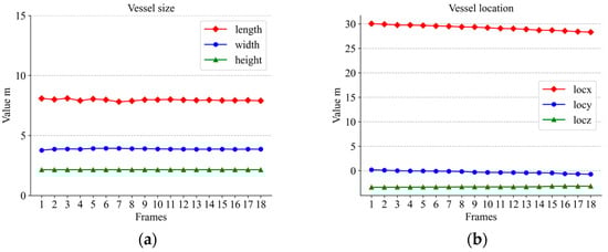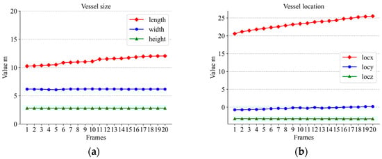 By comparing the detected hull dimensions with the true hull dimensions in Figure 12a, it can be concluded that the width fluctuation of large-sized vessels was controlled to be less than 6.39% of the true value and the length fluctuation was controlled to be less than 3.45% of the true value. Similarly, the comparison between the dimensions in Figure 13a and their true values reveals that the fluctuation of the width for medium-sized vessels was below 13.6% of the true value and the fluctuation of the length was controlled below 2.3% of the true value. Among the three boat sizes, smaller-sized boats exhibited the least fluctuation, with length varying at less than 4.8% of the true value and width fluctuating at less than 1% of the true value, as in Figure 14a. The position change curves of the vessels in Figure 12b, Figure 13b and Figure 14b show that the tracking effect was stable for large-sized vessels.