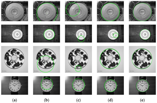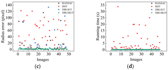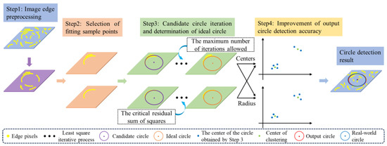 Hough transform (HT) has received attention from a wide range of scholars due to its insensitivity to noise and ease of implementation in parallel computing. However, the HT algorithm has a long computation time and requires a large storage space, making circle detection inefficient. To solve this problem, Xu et al. [8] proposed the randomized Hough transform (RHT). The RHT algorithm maps multiple pixels on the edge to a single point in the parameter space. It determines the circle’s parameters by randomly obtaining three points in the parameter space, which can significantly reduce the computation time and storage space. Consequently, many scholars have conducted studies based on the RHT algorithm [9,10]. Nonetheless, the algorithm uses three points instead of all points along the circle edge in order to determine the circle parameters, which may reduce the detection accuracy. To enhance the probability that the three points belong to the same circle, Wang [11] proposed an improved RHT method integrated with a fitting subpixel circle detection algorithm, where he removed isolated points after edge extraction. The method effectively eliminates the noise and improves circle detection accuracy. To better remove noise and determine the fitted sample points, Jiang [12] proposed an efficient stochastic Hough transform circle detection algorithm based on probabilistic sampling and feature points, which optimizes the methods of determining sample points and finding candidate circles. Experimental results show that the algorithm improves the effectiveness of sampling the fitted sample points and prevents the fake circles from being regarded as candidate circles. Both the RHT algorithm and the improved algorithm based on RHT obtain the circle parameters via random sampling, which is challenging to apply to circle detection in complex images because the number of noise points in complex images is more than the number of feature points at the circle edge.