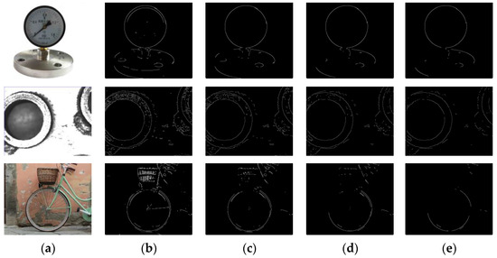 Edge detection is used in many object edge detection applications to observe image features based on a significant change in the gray level. In addition, it can reduce the amount of data in an image while preserving its structural properties [21]. Therefore, the classical Canny edge detection algorithm is used for the extraction of edge features in images [22]. The edge detection accuracy depends on the thresholds, and a series of pre-experiments are conducted to determine the appropriate thresholds. By analyzing the pre-experimental results, applicable high and low thresholds are selected to extract information about the target edges.