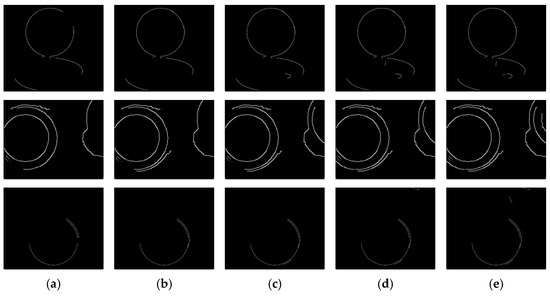 As shown in Figure 2, the Gaussian kernel size is 5 × 5, 7 × 7, and the corresponding edge detection results have many interfering points and pseudo edges around the detected edges. This phenomenon may reduce the single-circle detection accuracy. The filtering effect is better when the Gaussian kernel size is 9 × 9, 11 × 11. Nevertheless, excessive Gaussian kernel size may cause some target edges to be filtered out, which leads to significant deviations in the circle detection results. Thus, the Gaussian kernel size chosen in the DBLSKCF algorithm is 9 × 9.