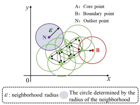 The DBSCAN algorithm clusters sample points into different classes based on the size of their neighborhood density. The clustering principle is shown in Figure 4. Formula (5) is used to classify the sample points. If the number of sample points in the neighborhood of sample point A is greater than or equal to the minimum number of sample points, the sample point A is classified as a core point. If the number of the sample points in B’s neighborhood are less than the minimum number of sample points, point B is classified as a boundary point. If the number of sample points in N’s neighborhood is 0, point N is classified as an outlier point.
