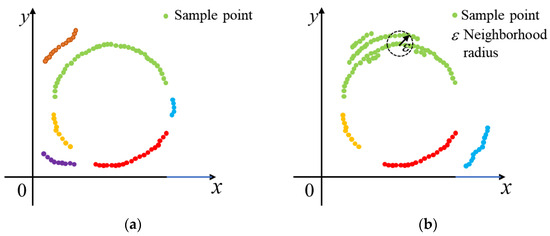 DBSCAN clustering results: (a) main contour; (b) main contour and outer interfering points. Note: Different-colored sample points in the figure represent different clustering results.