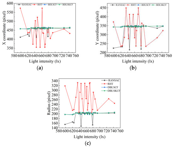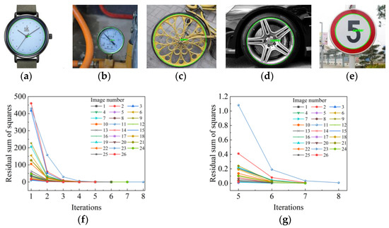 Least squares fitting of circles (LSC) [16,17,18] is the method of fitting a circle by minimizing the sum of the squares of the distances between the sample points and the corresponding points on the fitted circle, which has a high fitting accuracy and faster detection speed compared with the RHT and RANSAC algorithms. However, the results obtained based on the LSC algorithm are easily affected by noise. Therefore, scholars have improved and compared the LSC algorithm. Zhou et al. [19] proposed the MFLS algorithm, which removes the noise points by establishing a mathematical model in polar coordinates and then uses the LSC algorithm for circle fitting. The method has high positioning accuracy. However, the detection results may be seriously affected when the noise points are not entirely removed. To detect the parameters of the punched circle quickly and accurately, Cao et al. [20] proposed a circle fitting method based on LSC and the mean shift algorithm. This algorithm concentrates the center of the fitted circle around the true circle’s center in order to obtain the best actual circle. Experiments show that this algorithm detects circles faster than the RHT algorithm.