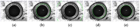 Single-circle detection has many application scenarios, namely for use in automated inspection and assembly, the identification of weld joints and weld seams, PCB hole detection, and non-destructive testing [1,2,3,4,5]. For example, only the single circle in the image needs to be detected when welding the inner diameter edges of tube heat exchanger bores utilizing machine vision. In the abovementioned fields, the circles to be detected are usually present in complex images. Complex images are images with multiple contours, intricate textures, mass noise, and various levels of brightness, generally containing a lot of information about edge and structure. Therefore, the task of circle detection in complex images and obtaining the localization and shaping parameters of the circle is more challenging. Widely used circle parameter detection methods include random sample consensus, stochastic Hough transform, and least squares, with good robustness and accuracy [6,7].