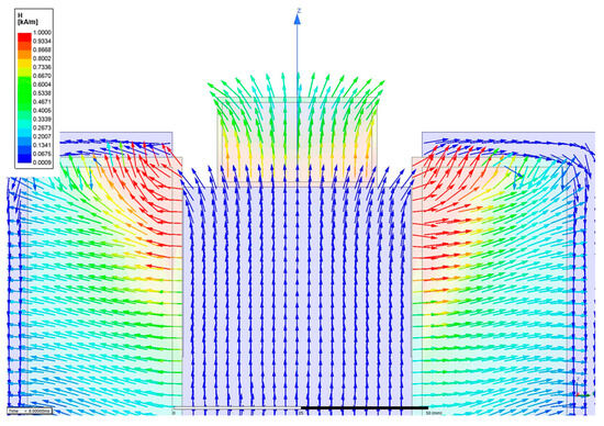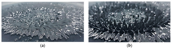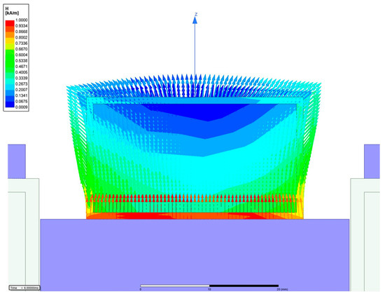 Figure 6 shows that the CIP chains within the MRF extended from the surface zone of the MRE according to the direction of the magnetic field. The change in modulus under the influence of the magnetic field on the MRE was basically confirmed. In addition, a tactile structure was designed, manufactured, simulated, tested, and verified with the expectation that it could contribute to dynamic shape change under the influence of the magnetic field on the MRF.