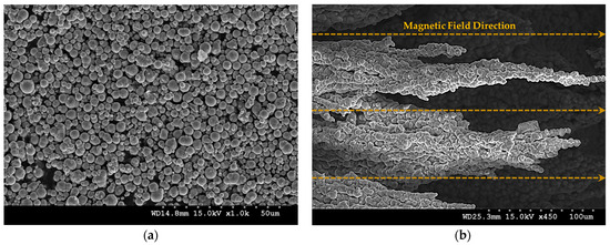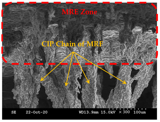 The modulus seemed to increase linearly, but the modulus increased significantly from the fourth section with a nonlinearity that was difficult to predict. It was confirmed that the modulus characteristics of the MRE changed depending on the magnetic field. The target of this study was to use MRF and MRE together. To determine what kind of effect it would have when MRE was used together with MRF, we magnetized them together and observed them using a scanning electron microscope. To prepare for this, an additional magnetization device was prepared. To capture the zone of the surface of the MRE and the shape of the CIP chains extending within the MRF base oil, a magnetization time of about 2 h was given before producing the SEM specimen, and post-treatment of the surface coating of the specimen was performed.