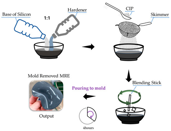 19]) was selected as the base material for producing the magnetorheological elastomer. Considering the various hardness levels of silicone rubber, a flexible and stable material was required to mimic human skin. Therefore, silicone rubber with a low hardness level was chosen. This material is used to artificially replicate human skin in artificial organ models and special makeup applications. It was judged suitable for creating MRE when mixed with CIP due to its excellent elasticity and stability, allowing for recovery when subjected to external forces or removal. Additionally, the selected material, despite its low hardness, did not exhibit stickiness after hardening, making it easy to mix with CIP during production. Furthermore, it had a short curing time of 4 h at room temperature, which was advantageous for the production process.