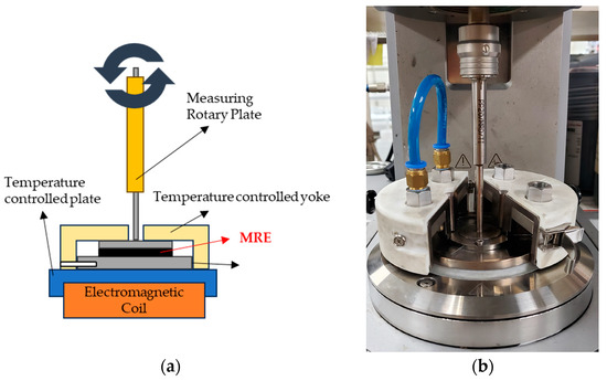 22]. However, in this experiment, it was expected that there would be a risk of detachment from the base material if a large amount of CIP was used because the MRE was to be repeatedly deformed. After manufacture of the MRE, it was confirmed via rheology testing that its MR effect was continuously and sufficiently acceptable with 50 wt% CIP. An Anton Paar MCR-302 (Anton Paar Company, Graz, Austria MCR 320 model, Molecular Compact Rheometer [