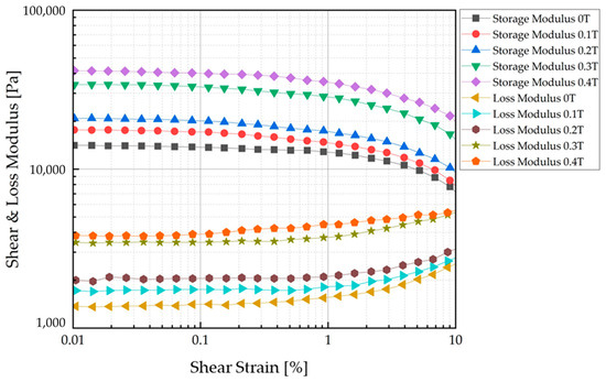 Figure 5. The storage modulus is associated with the elastic component of the material (stored energy), while the loss modulus is associated with the viscous component (dissipated energy). The modulus value gradually increases for each magnetic field strength. As a reliable section, we refer to the modulus value near 0.1%, where it shows stability. As the magnetic field increases, the rate of increase in the storage and loss moduli increases. The data corresponding to the 0.1 T interval are shown in