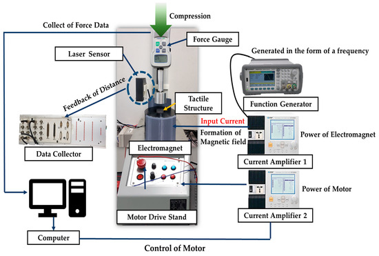 Figure 13. Two experiments were conducted. First, a stress relaxation test was conducted to measure data on repulsive force. This is an experiment that measures the change in stress of the tactile structure under a certain strain depending on the magnetic field strength. A force gauge was used to measure the repulsive force, and the unit was Newtons. The compression ratio was 10%. The displacement was measured using a laser sensor. The motor drive stand was controlled using a computer to specify the degree of compression. Since the first test was an experiment in which the magnetic field strength was given statically, a total of five types of experiments were conducted within the current range from 0 to 1.23 A at intervals of 0.31A.