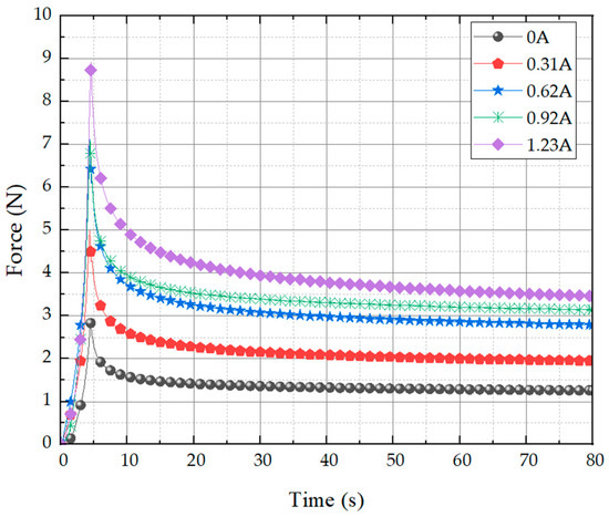 Figure 14. The instantaneous force is shown to soar across all currents and then converge to a constant value. It can be seen that the field-dependent repulsive force measured for the proposed tactile structure exhibits stress relaxation behavior, which is a typical property of viscoelastic behavior. The most notable feature is that as long as the current is continuously supplied, it does not fall below a certain value. When compressed to about 10% of the maximum peak, this tactile structure can be viewed as having a control range of 2.8~8.8 N based on the peak value and 1.2~3.5 N based on the relaxation value under the control of the maximum current that can be applied.