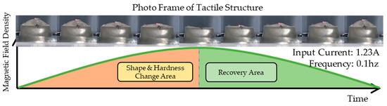 Table 3 confirms that the displacement amount is different for each frequency even though the current value is the same. This is because the tactile structure contracts and relaxes and cannot keep up with the speed at which its shape changes. At a relatively low-frequency input current, the shape has enough time to deform, so a large amount of deformation can occur. Conversely, at a high-frequency input current such as 1 Hz, there is not enough time for the shape to deform. In this phenomenon, the chains within the MRF are formed and the magnetic field is released again as they settle into the MRE cover, causing the contraction to continue for a certain period before returning to its original state. Thus, the response time of the MRF is very important to obtaining fast dynamic motion of the proposed tactile structure.