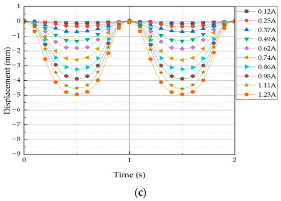 For the next test, the displacement was tested with input currents at 0.1 Hz, 0.5 Hz, and 1 Hz, and displacement data were measured at the top of the tactile structure using a laser sensor. All experiments were conducted in a total of 10 stages of testing from 0.12 A to 1.23 A at 0.13 A intervals. It was observed that as the current application increased, the displacement increased at the interval. The experimental results are shown in