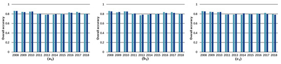 Performance of models with traditional yearly training (S1). The panels, (a1–a5), (b1–b5), and (c1–c5) depict the accuracy indicators (i.e., overall accuracy, precision, recall, F1 score, and kappa coefficient) for U-Net, U-Net 3+, and TransU-Net, respectively.