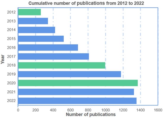 Number of papers related to human motion wearables published from 2012 to 2022. (Note: the statistics of publications come from ‘Google Scholar’, ‘Web of Science’, ‘CNKI’, and ‘Baidu Scholar’. The green color represents the key years).