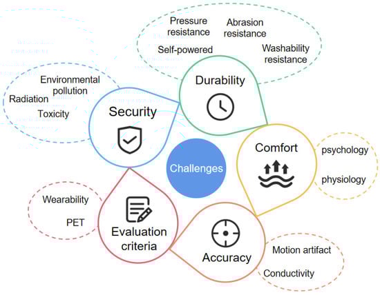 The high power consumption of sensors, data processing, and analytic hardware limits the durability of wearable device operation [139]. Reducing the sensor accuracy or switching the standby and wake-up states of the wearable system can alleviate this problem. Alternatively, some scholars have developed innovative self-powered devices [140,141]. They convert solar energy, human movement mechanical energy, etc. into electrical energy. However, the energy supply efficiency of flexible electronic devices in current research is very low and cannot meet real-time wearable needs. In addition, to ensure the durability and monitoring accuracy of smart clothing after multiple washes, intelligent wearable devices should have the capability of wearing resistance, pressure resistance, bending resistance, and washability.