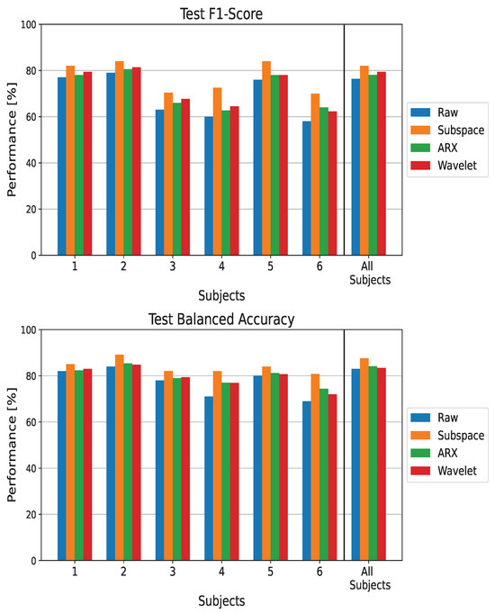 Figure 6 reports the results for the Siamese Neural Network. In agreement with our previous results, domain-specific preprocessing improves the performances of ErrP detection for each subject as well as in the population-wise analysis. Greater improvements in both balanced accuracy and F1-score result when the subspace regularization method is used. For the other two architectures, subjects 4 and 6 experience the largest improvements in terms of performance, with and in terms of balanced accuracy and and in terms of F1-score, respectively.