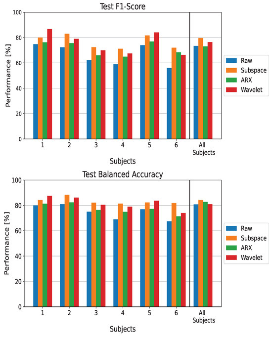 Performance metrics on the test set when using EEGNet as a classifier. The metrics are reported for each processing technique and in both subject-wise and population-wise analysis. The balanced accuracy and F1-score are reported for completeness.