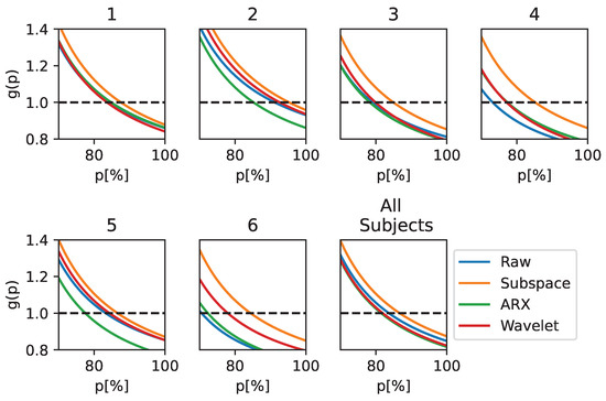 The utility gain curves for the L-CNN classifier are shown in Figure 5; again, they show that the introduction of a correction system with subspace regularization for ST estimate improves the BCI performance in most cases, resulting in higher accuracy compared to the other techniques. This is particularly apparent for subjects 4 and 6, where a is measured until and , respectively. For the other performance metrics, in terms of the utility gain, subjects 1 and 5 show more improvement when using the CWT to estimate the ST.