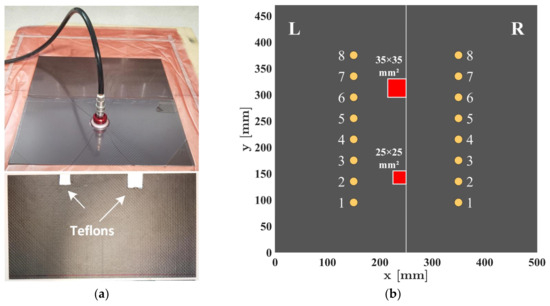 A SHM measurement system was developed to assess the condition of a composite lap joint containing two artificial disbonds of different sizes. These artificial disbonds were created by inserting Teflon films between the adhesive and one of the composite plates. To create the specimen, two 1 mm thick composite plates from Easy Composite (Stoke on Trent, UK) (product code: CFS-RI-1-0056) were bonded as a lap joint using Araldite 2011 adhesive. The vacuum bagging technique was employed to fabricate the specimen, and the disbonds were positioned at the lap joint’s boundary, as depicted in Figure 1a. Specimen sizes, sensor positions, and disbond locations are shown in Figure 1b, where a central borderline separates the adhesively bonded region (L) from the single plate side (R).