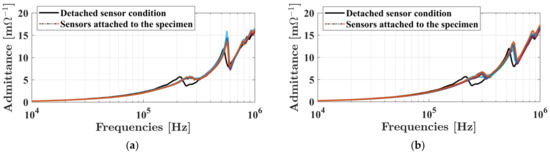 Magnitude of the admittance signature of the sensors including the sensor reference signature in air condition: (a) sensors attached above the single composite plate; (b) sensors attached above the bonded part.