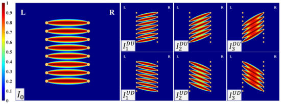 In the above equations, is the damage intensity distribution obtained by parallel beams emitted from sensors within one array with their corresponding sensors located in the other parallel array. is the total number of sensors in one side of the parallel array. represents parallel beams oriented from the transmitters to receivers, which are positioned k sensors higher than those of the corresponding transmitters. Conversely, represents parallel beams that are emitted from the transmitters to receivers located k sensors lower than the corresponding transmitters. is the total number of oriented parallel beam groups considered for damage imaging. The value of is constrained to fall within the range of 0 to , allowing for a flexible selection based on the structure and sensor configuration. represents an array of damage indices derived from mapping the damage indices within each group of parallel beams onto a scale ranging from 0 to 1. Due to the lower energy of received UGWs that passes through a defect, formulation is designed in a way that the lowest value corresponds to 1, while the highest value corresponds to 0, and the reset of s receives in between accordingly. Note that the normalized vector of contains the damage indexes of both and . Cumulative damage intensity distribution through parallel beam emission and reception are depicted in Figure 5 for and , along with a constant for all sensor combinations.