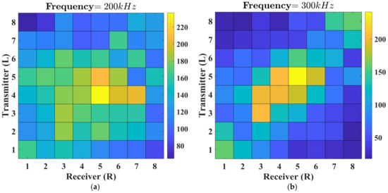 Heatmap of the maximum of the envelope for signals acquired by various sensor combinations and different central frequencies of the excitation: (a) 200 kHz; (b) 300 kHz.