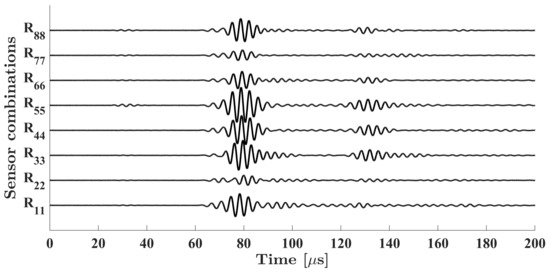 Example of signals acquired from sensor combinations within the group of , excited with the central frequency of 300 kHz.